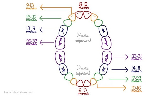 El orden suele ser: primero los 2 centrales de abajo (incisivos), luego 4 de arriba (incisivos centrales y laterales). Después los incisivos laterales de abajo. Más tarde 4 muelas, siguen los colmillos y finalmente completan la dentición de 20 piezas los segundos molares.